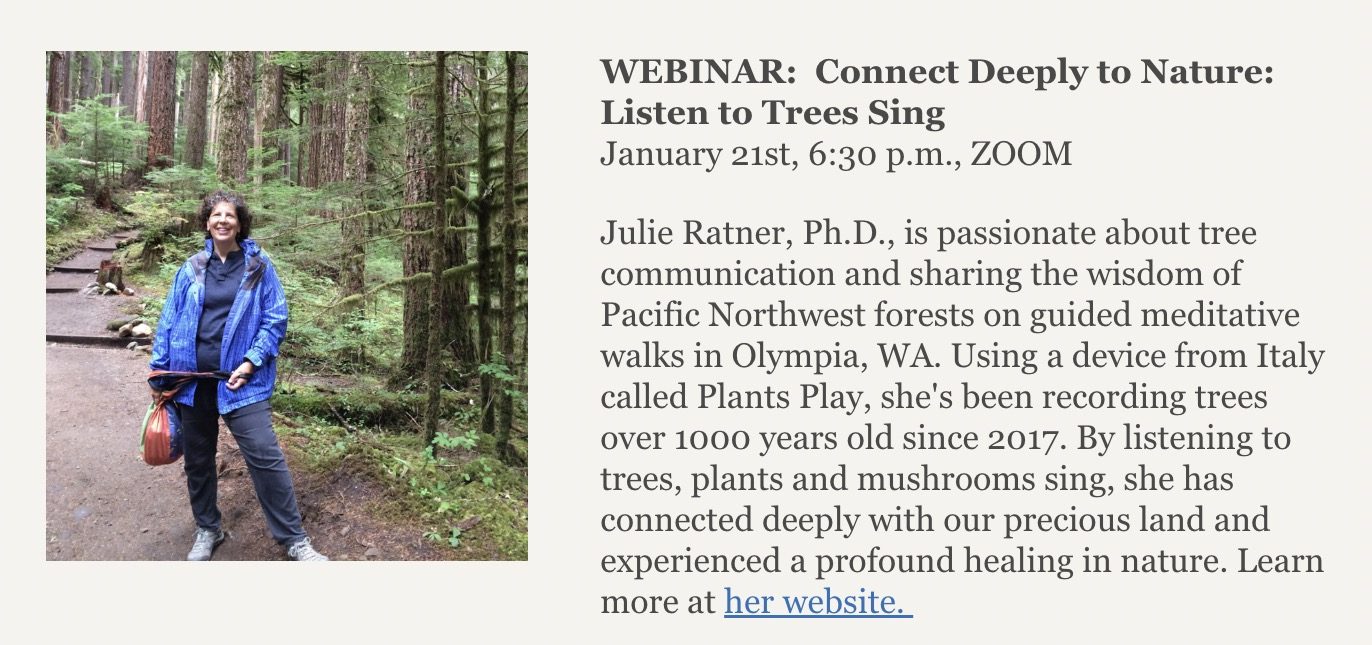 1-1:30 Tree stories: Listen to the words of poets & storytellers sharing heartfelt stories about trees and nature (Debe Edden, Beth Lembach, Tobey Ishii Anderson, Sandra Niman, Bowen Lee).